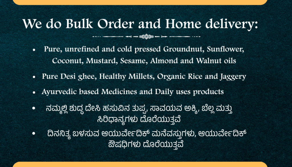 ಹೆಚ್ಚಿನ ಮಾಹಿತಿಗಾಗಿ ಅಥವಾ bulk order ಮತ್ತು ಮನೆ ವಿತರಣೆ ಸೇವೆಗಾಗಿ ನೀಡಿರುವ ಸಂಪರ್ಕ ಸಂಖ್ಯೆಯನ್ನು ಸಂಪರ್ಕಿಸಬಹುದು.